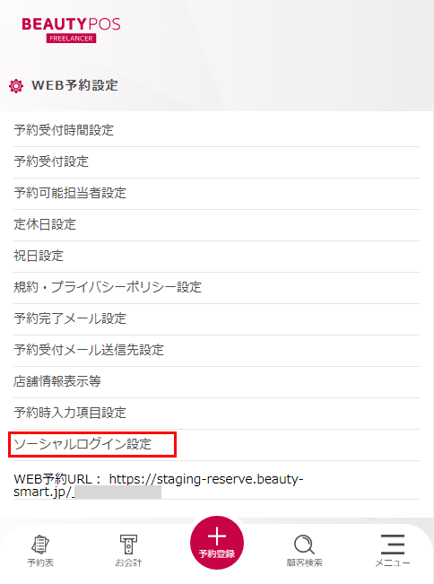「メニュー」>「WEB予約設定」を開いて「ソーシャルログイン設定」をタップしてください。