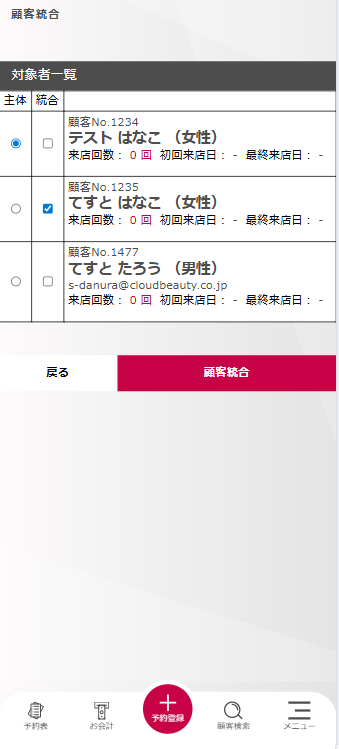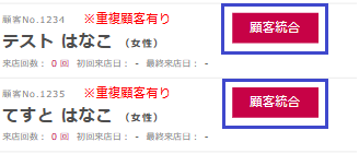 氏名・誕生日・電話番号のいづれかの情報が重複した場合に重複顧客とみなされます。