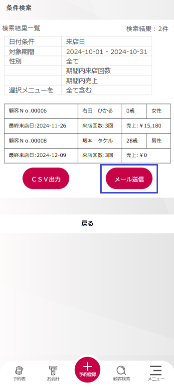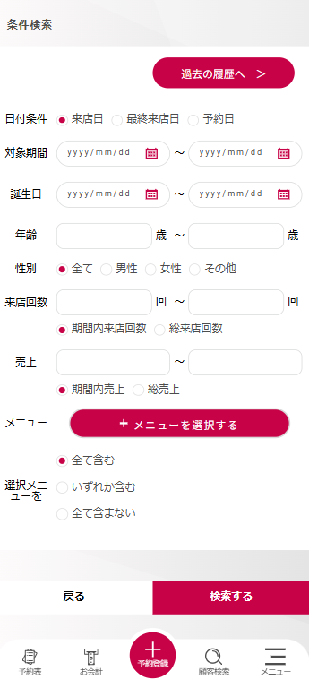 日付条件:来店日・最終来店日・予約日の中から選択します