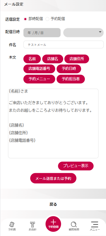 本文は、「名前」「店舗名」「店舗住所」「店舗電話番号」「予約日時」「予約メニュー」「予約担当者」ボタンをクリックすると、本文に反映します。