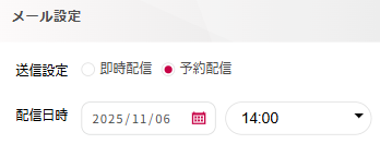 ⑧ 送信設定の〇即時配信 〇予約配信のどちらかを選択します。
