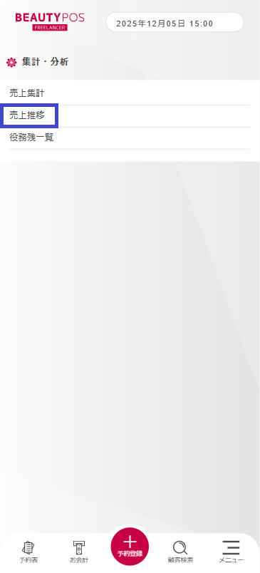 画面下部のメニューから「集計・分析」>「売上推移」の順にクリックします。